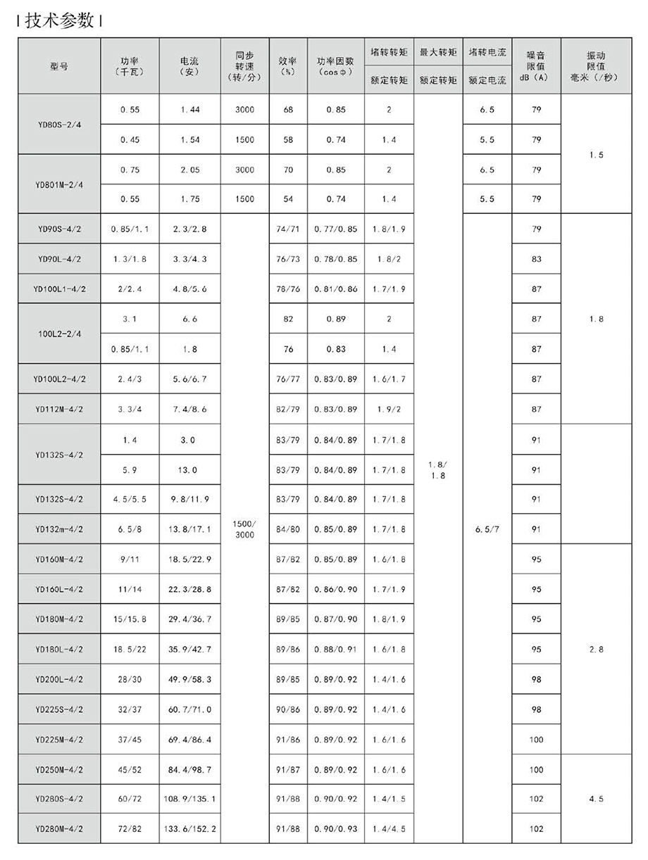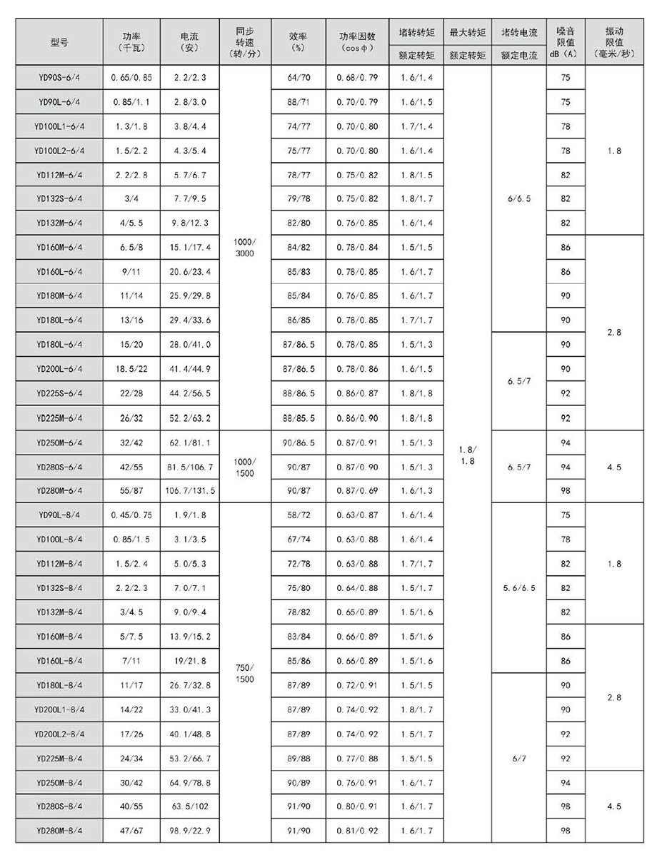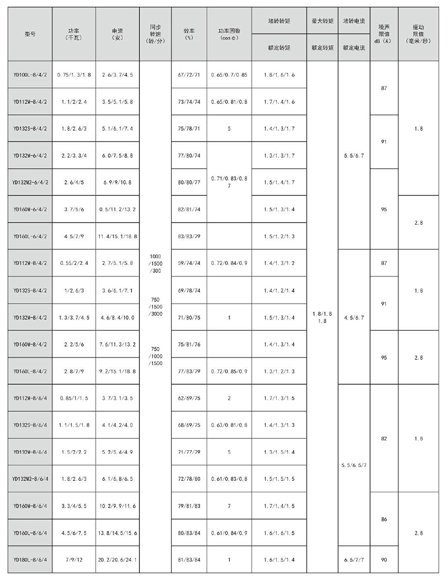YD系列變極多速三相異步電動(dòng)機(jī)可以與手動(dòng)控制、接觸器、控制器械等一起進(jìn)行速度控制,節(jié)約大量電能。采用改變繞組的接法來變換電機(jī)的轉(zhuǎn)速和輸出功率,使期與機(jī)械設(shè)備的負(fù)載特性相匹配,簡化了變速系統(tǒng),高效,節(jié)能。本系列電機(jī)轉(zhuǎn)速有雙速、三速和四速三種,極數(shù)比有412、6/4、8/4、12/6、6/4/2、8/4/2和8/6/4、12/8/6/4等九種,其主要性能指標(biāo)和國外同類產(chǎn)品的先進(jìn)水平相當(dāng),較老系列有較大提高。